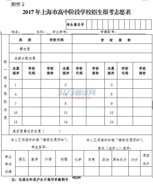 一、所有参加提前批和统一批招生录取的考生,均需慎重填写《2017年上海市高中阶段学校招生报考志愿表》(下称“志愿表”)。志愿表经考生及监护人签字确认后存区、三线单位招生部门。志愿表一经签字确认,不得补报、撤销或更改。