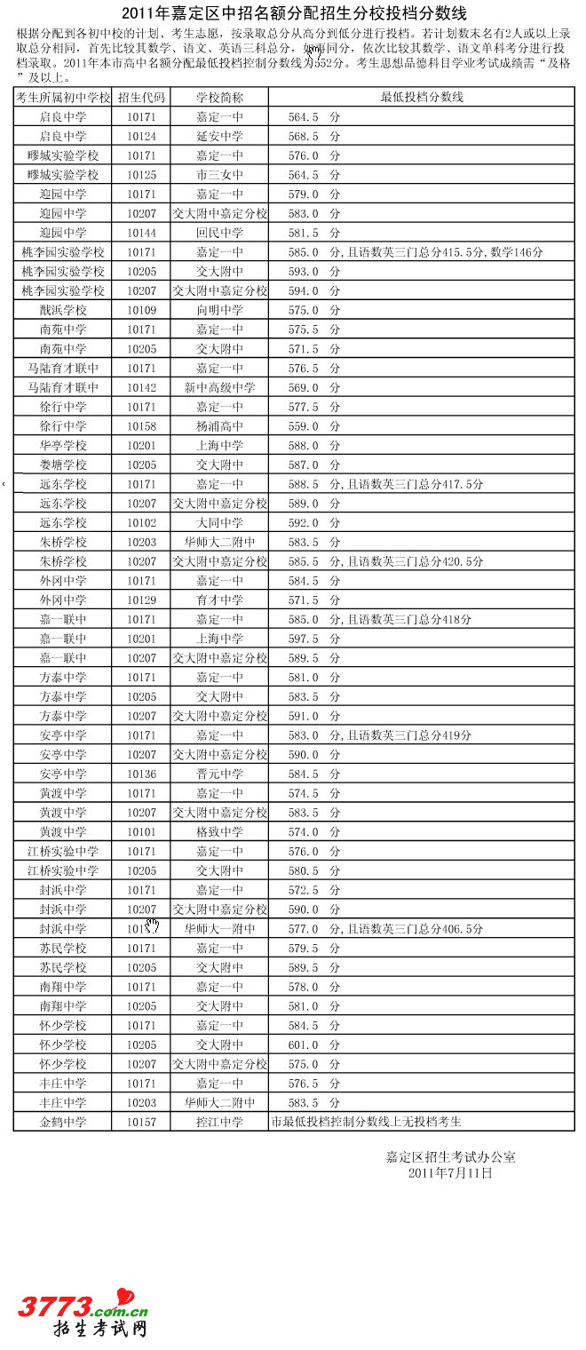 上海市嘉定区2011中考高中名额分配招生投档分数线