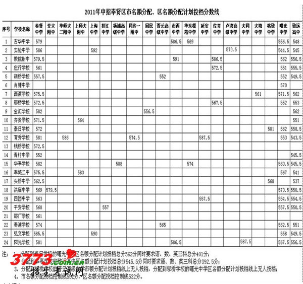 奉贤区2011中考中招名额分配计划投档分数线