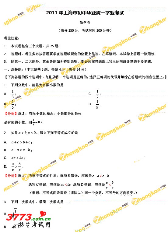 上海2011中考数学试题及答案