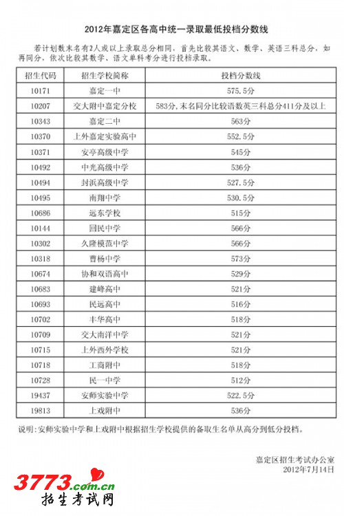 2012年上海嘉定区各高中统一录取最低投档分数线如下: