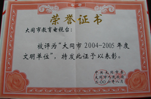 多年来,大同教育电视台在服务于全市的教育教学改革与发展方面,在服务于全市的政治文明建设、精神文明建设、经济建设、文化建设和构建和谐社会方面取得了突出成绩,受到了大同市委、市政府、市委宣传部、市教育局和社会的广泛好评。每年都有大量参评节目在全国获奖。1998年被评为“全国先进教育电视台”;2004――2005年度被评为“全国教育电视先进集体”,2004――2005年度被市委、市政府评为“大同市文明单位”、2004年――2007年被省文明办评为“山西省双拥工作先进单位”。现已成为中国教育电视协会常务理事单位、中国黄河电视台协作体成员台。