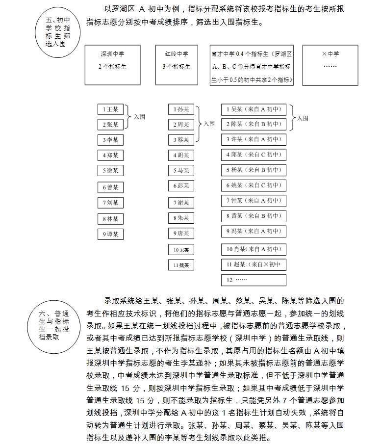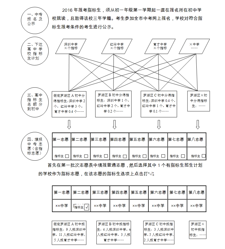 为帮助考生直观形象地理解指标生分配和录取办法,市招考办制作了《深圳市2016年指标生名额分配和录取办法示意图》,考生可通过“深圳招考网”或《考生报考指导手册》查阅。