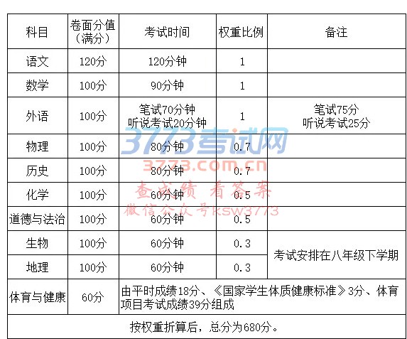 《方案》中,中考的满分从目前的460分增到680分,其中,语文满分为120分,数学满分为100分,外语满分为100分(其中75分为卷面考试分值,25分为听说考试分值)。物理、化学、道德与法治、历史、生物、地理科目卷面考试分值均为100分,按不同权重比例计入录取总分。物理、历史按0.7的权重计入总分,化学、道德与法治按0.5的权重计入总分,生物、地理则按0.3的权重计入总分。