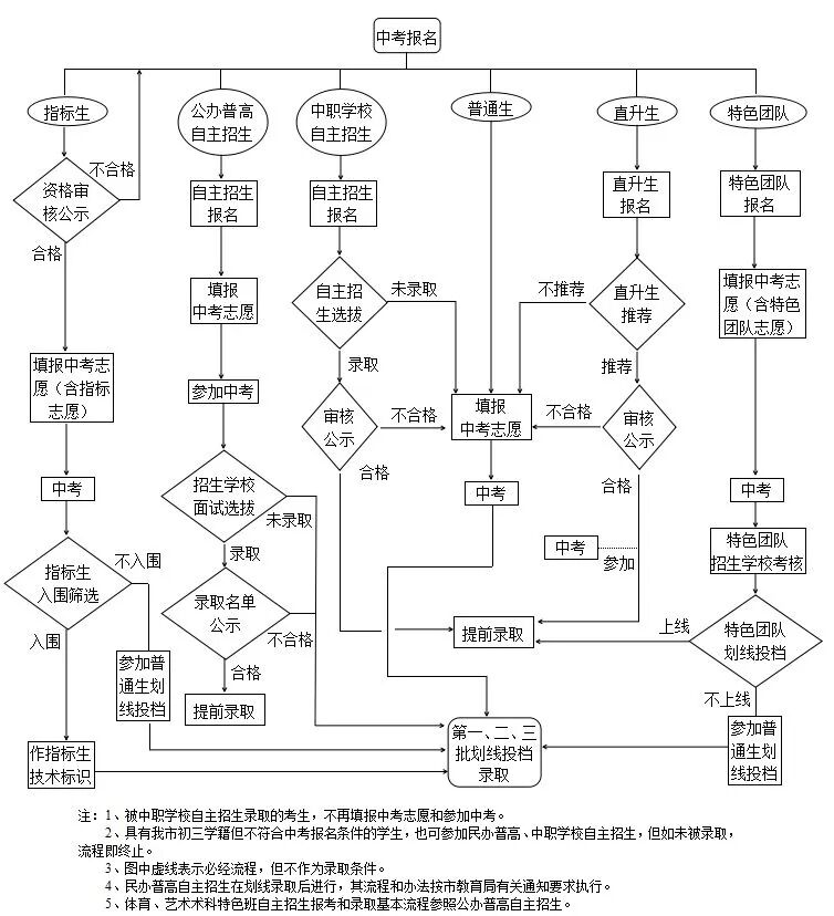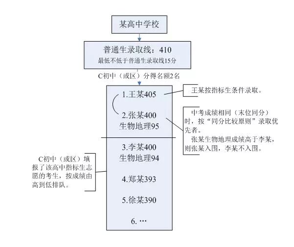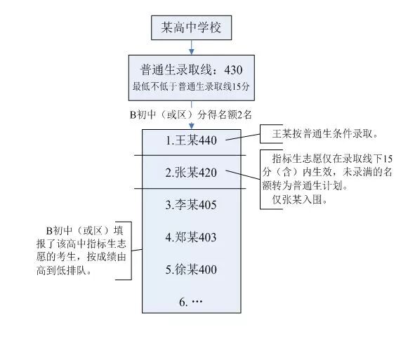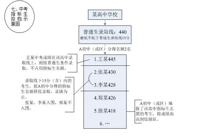 高中学校录取指标生按初中学校报该高中学校的考生人数,从高分至低分录取,但最低不低于该高中学校普通生录取线15分。录取时,首先在中招录取系统中对入围指标生的指标生志愿作相应技术标识,然后将指标生志愿连同非指标生志愿,与普通生一起划线投档。