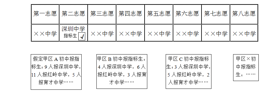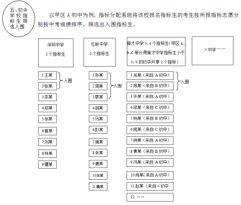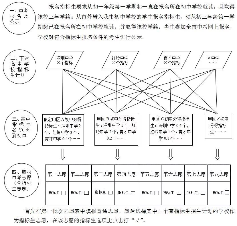 为帮助考生直观形象地理解指标生分配和录取办法,市招考办制作了《深圳市2018年指标生名额分配和录取办法示意图》,考生可通过“深圳招考网”或《考生报考指导手册》查阅。
