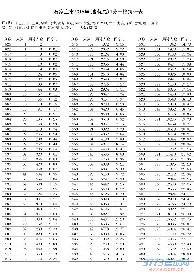 2015石家庄中考各县区成绩一分一档表(含加分) 石家庄市 长安区 桥东区 桥西区 新华区 井陉矿区 裕华区 辛集市 藁城市 晋州市 新乐市 鹿泉市 井陉县 正定县 栾城县 行唐县 灵寿县 高邑县 深泽县 赞皇县 无极县 平山县 元氏县 赵县