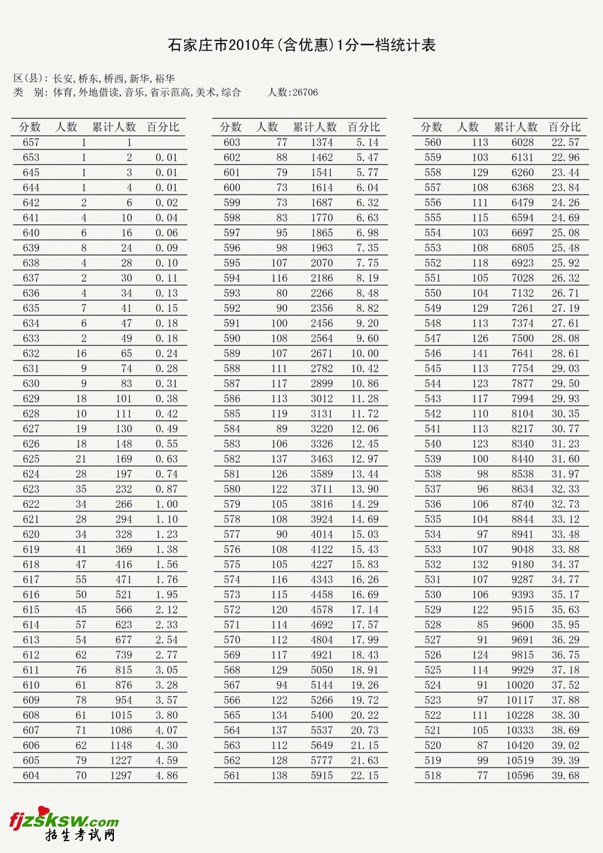 2010年石家庄中考成绩1分一档统计表(市内五区)