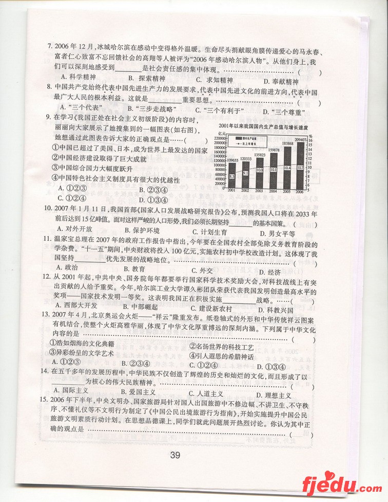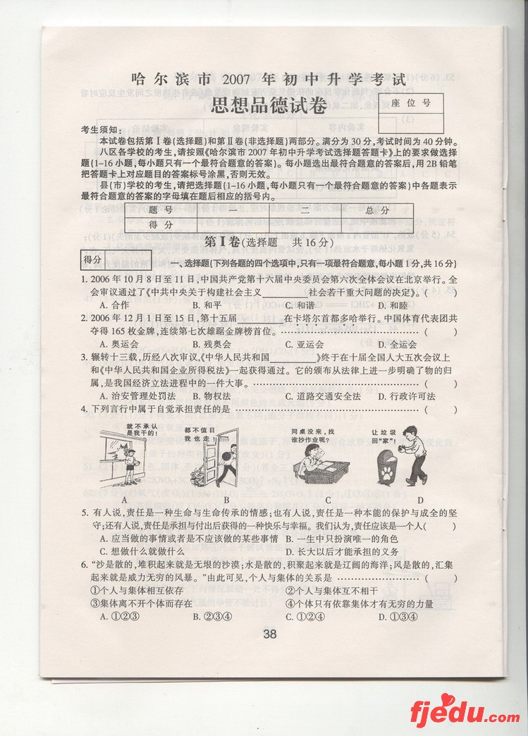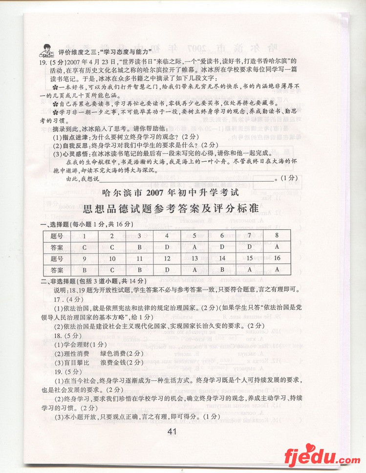 2007年哈尔滨市中考思想品德试题、答案及评分标准