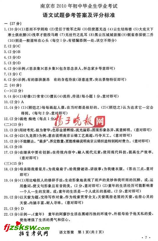 2010年南京市中考语文试题及答案