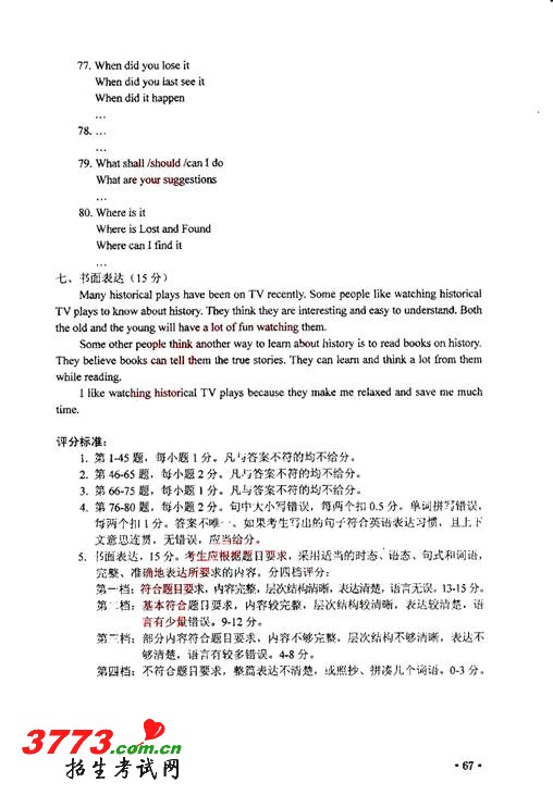 2012年河南省中招考试英语试卷真题答案及评分标准