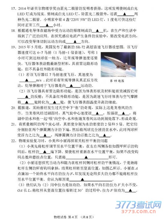 2015年苏州中考物理试题及答案发布