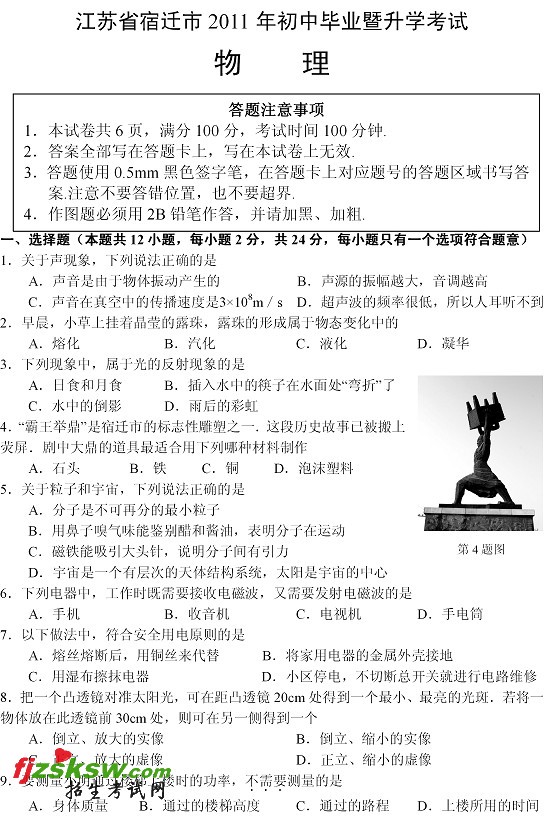 江苏宿迁2011中考物理试题及答案