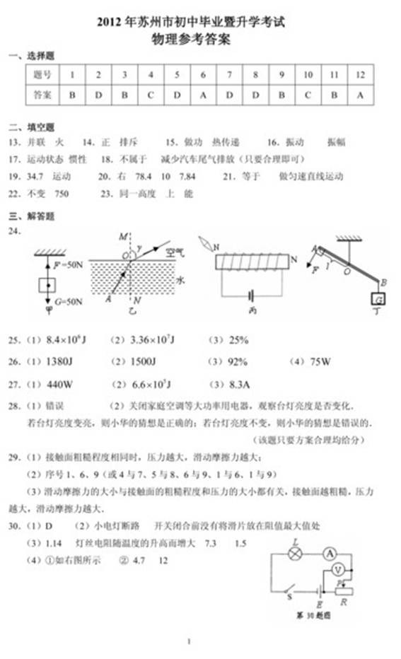 2012苏州中考试题试卷答案