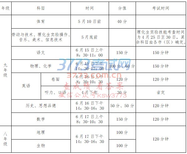 劳动与技术、理化生实验操作、音乐、美术、信息技术5月底前 理化生实验技能考查时间为4月25日至30日,其余科目由各市(区)确定。