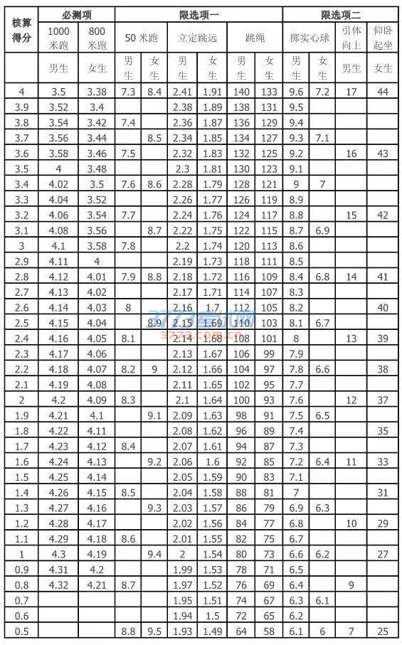 天津市2017年初中毕业升学体育统一测试成绩评定标准