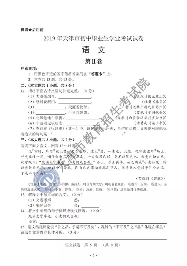 2019年天津市初中毕业生学业考试试卷及参考答案发布