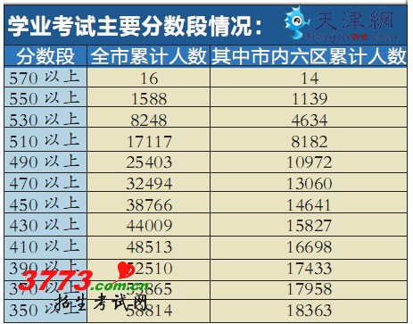 今年学业考试成绩满分为560分,体育考试平时成绩满分为18分,体育考试统一测试成绩满分为12分,总分满分为590分。学业考试全市总平均分为393.73分,其中市内六区为458.38分。