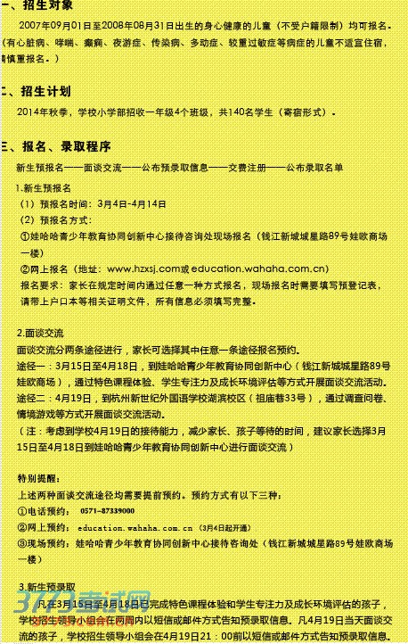杭州新世纪外国语学校小学部2014招生简章