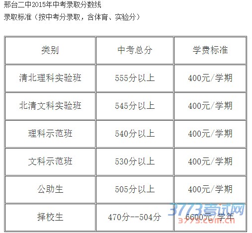 邢台一中2015年中考分数线