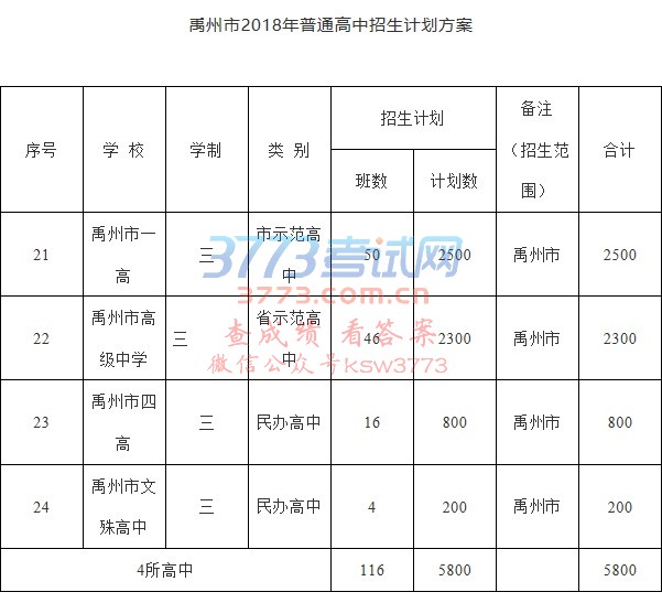 禹州市2018年普通高中招生计划方案 序号学 校学制类 别招生计划备注 (招生范围)合计 班数计划数 21禹州市一高三市示范高中502500禹州市2500 22禹州市高级中学三省示范高中462300禹州市2300 23禹州市四高三民办高中16800禹州市800 24禹州市文殊高中三民办高中4200禹州市200 4所高中1165800 5800