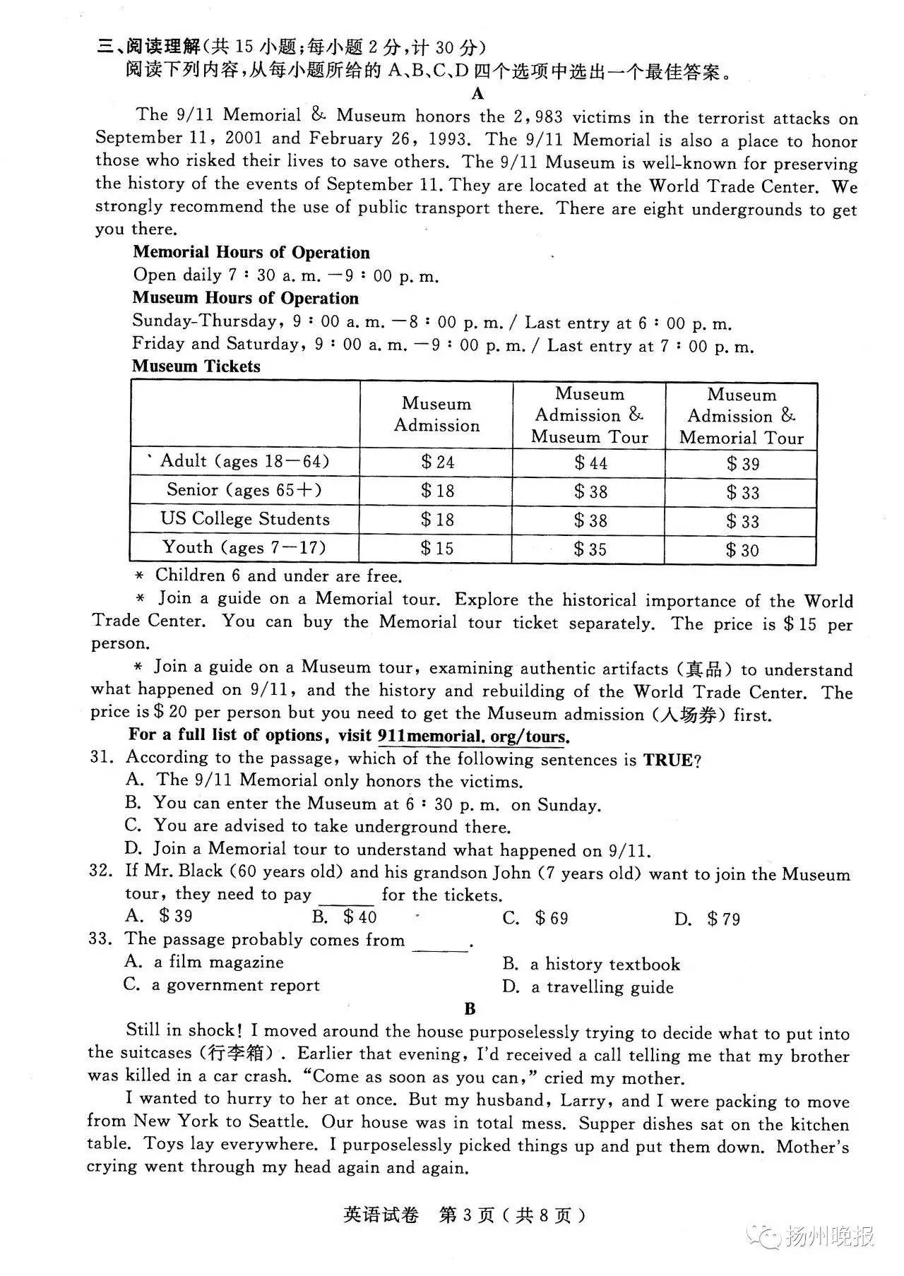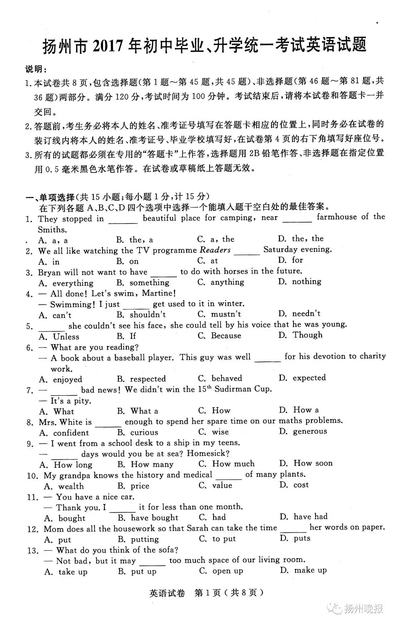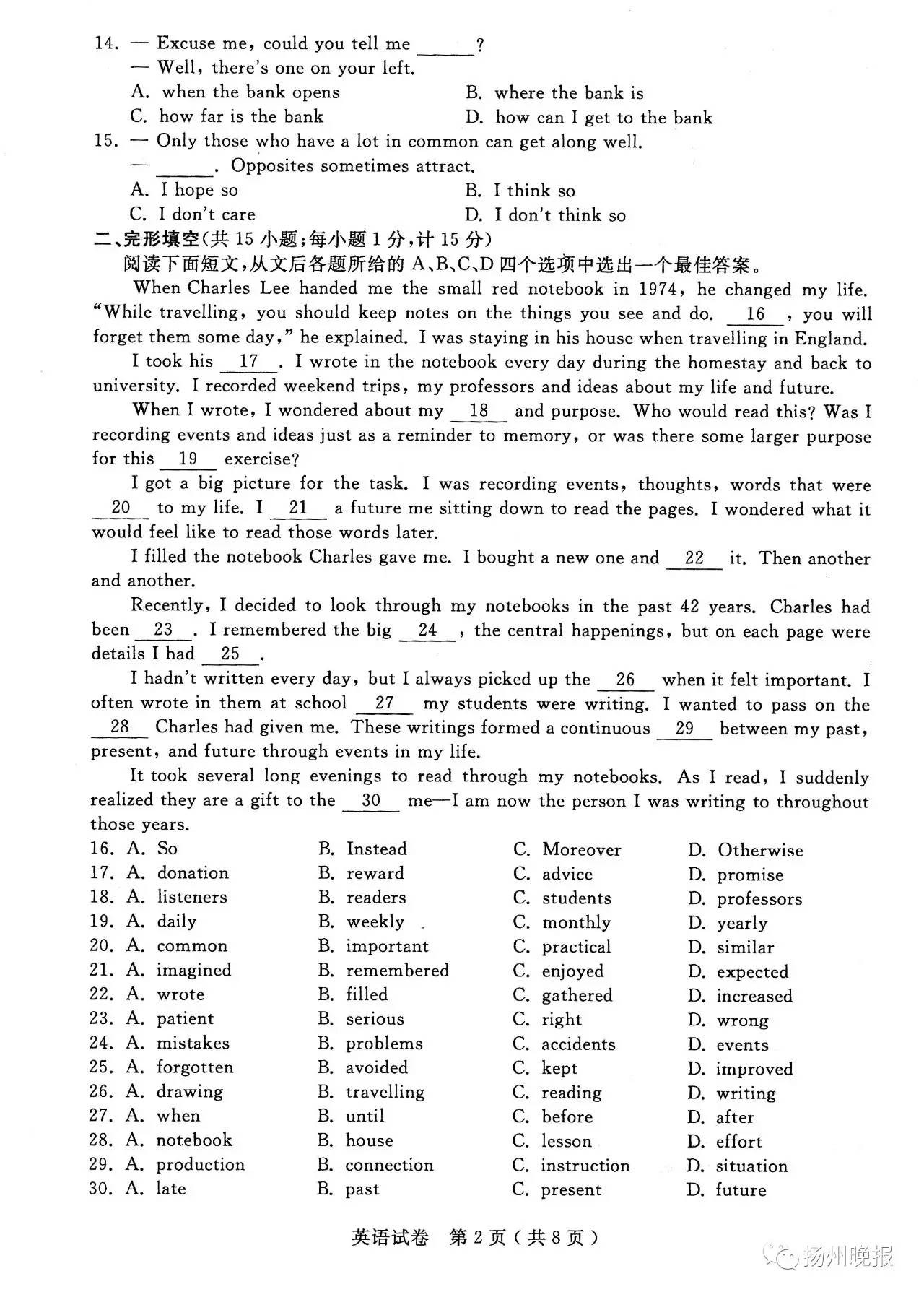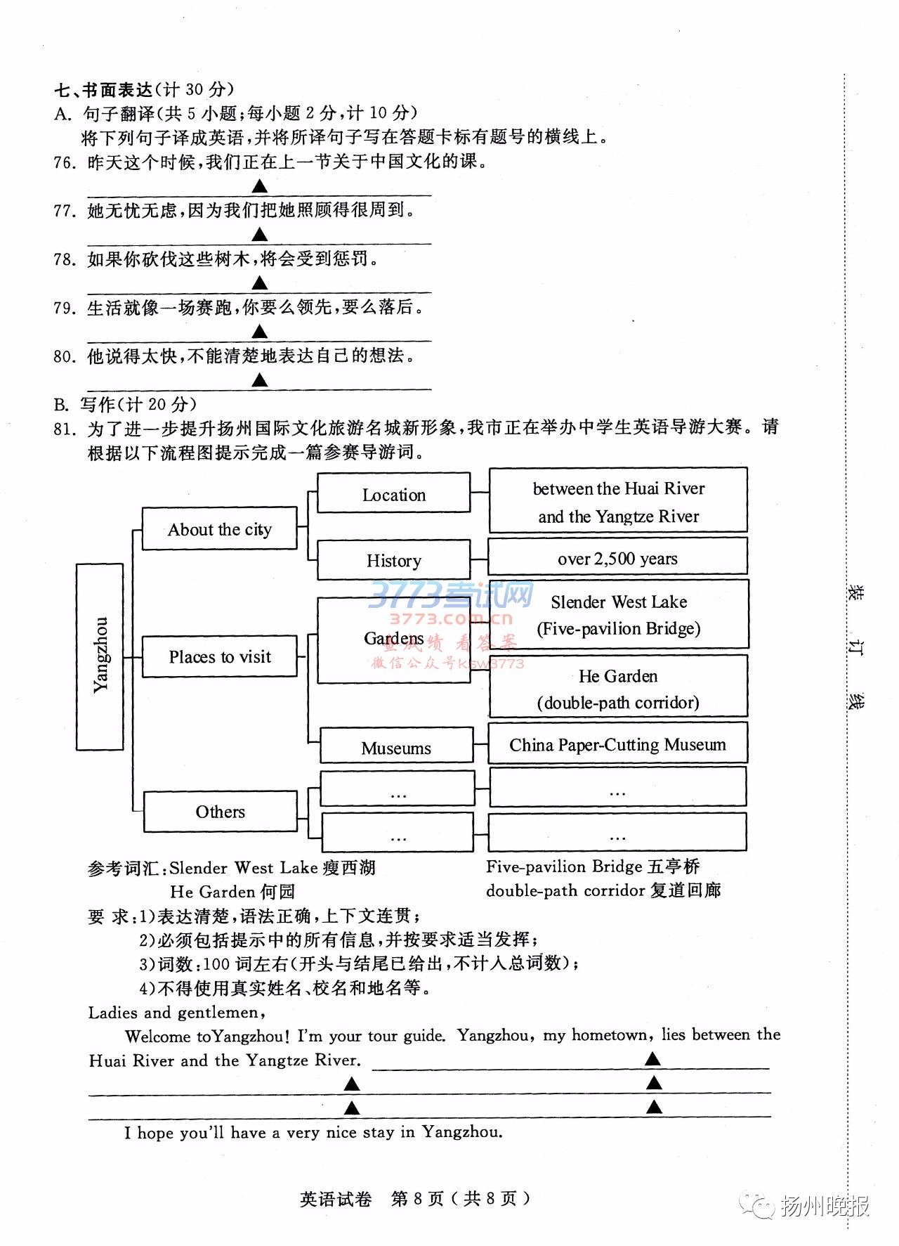 作文坚持“开放性”,寓基本写作能力考查于平常之中。书面表达是“我市正在举办中学生导游大赛,请根据以下的流程图完成一篇参赛的导游词。”字数100个左右,开头与结尾已给出。作文命题有时代元素,更有扬州元素。内容贴近生活、贴近时代、关注热点、体现扬州地方特色。考生只要平时认认真真进行写作训练,具备基本的写作能力,运用平时所学就能写出不错的文章。