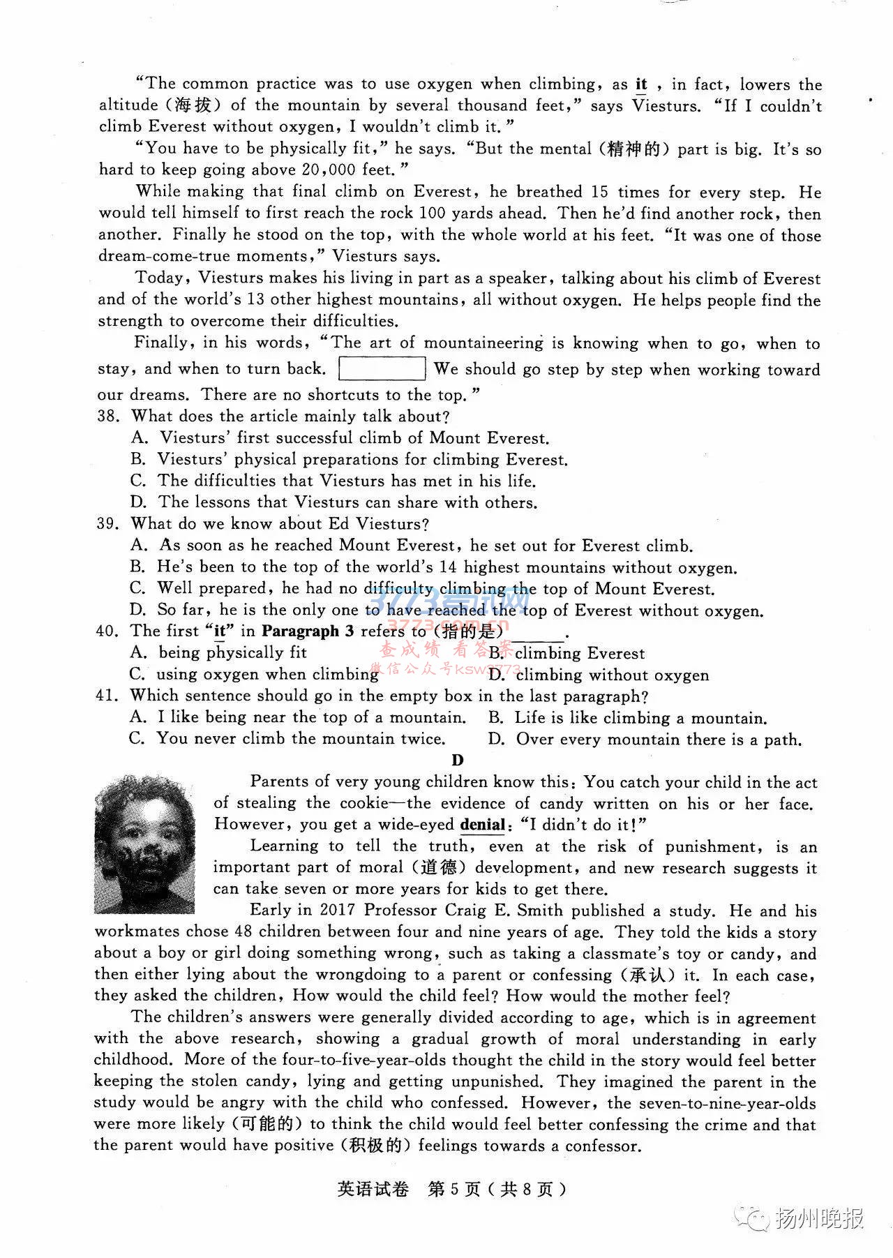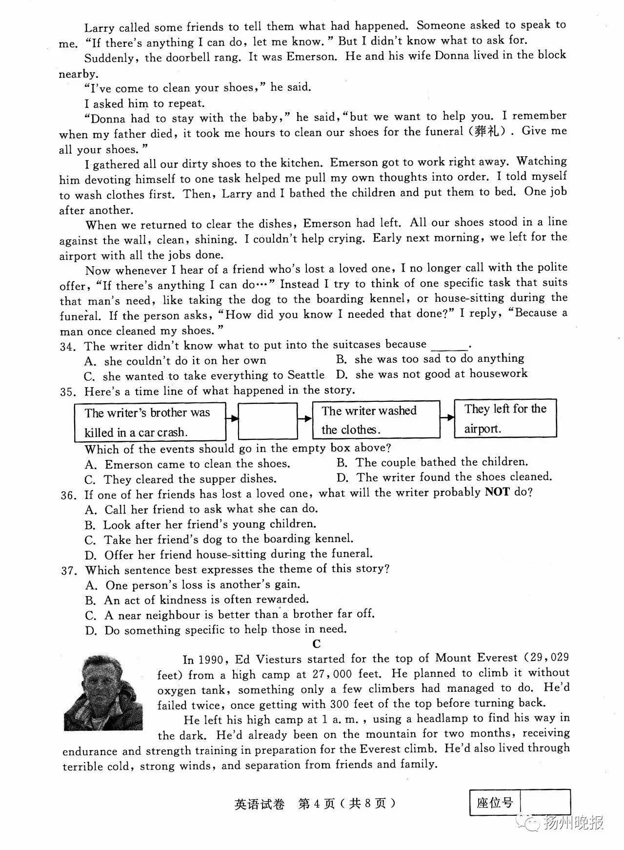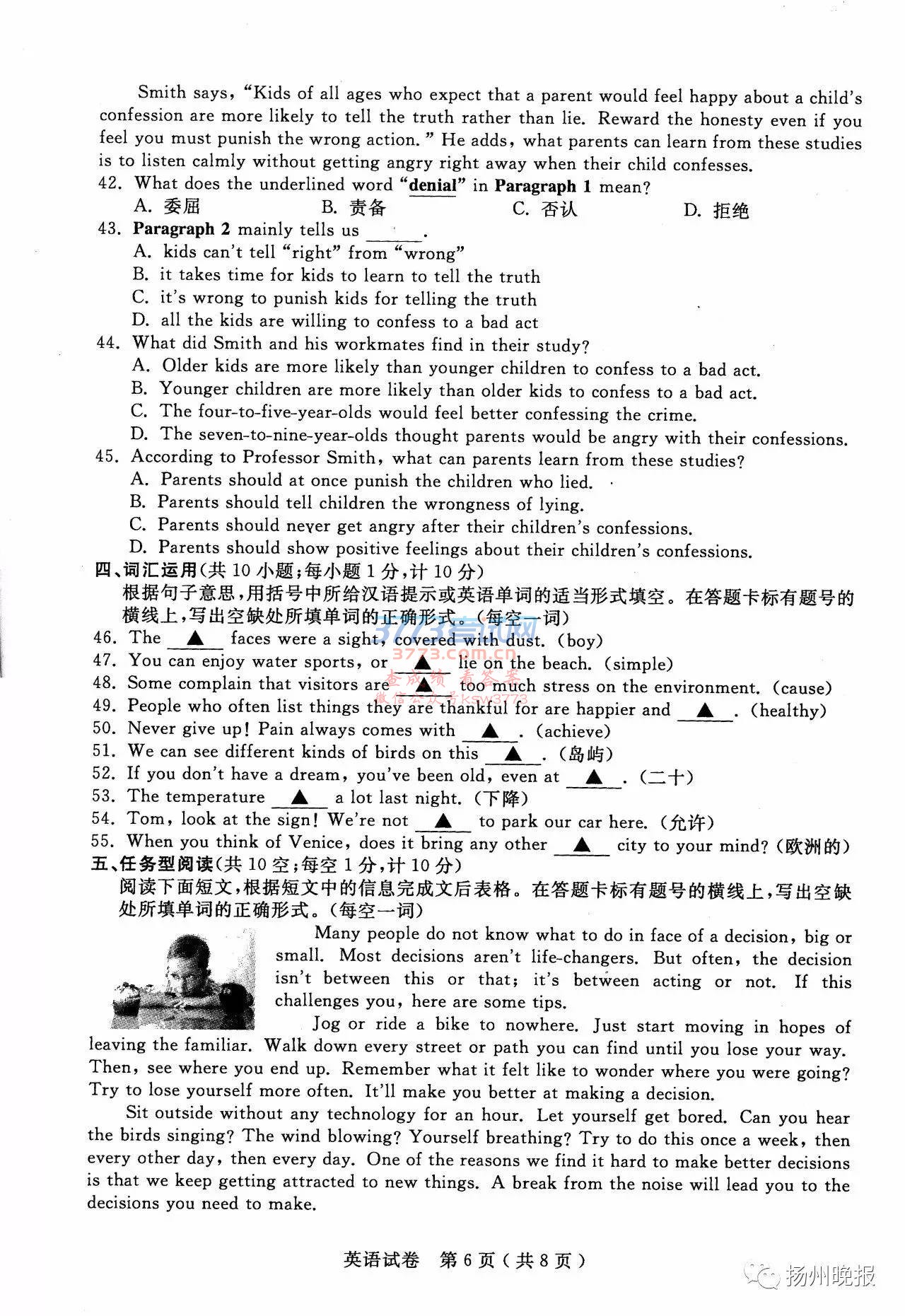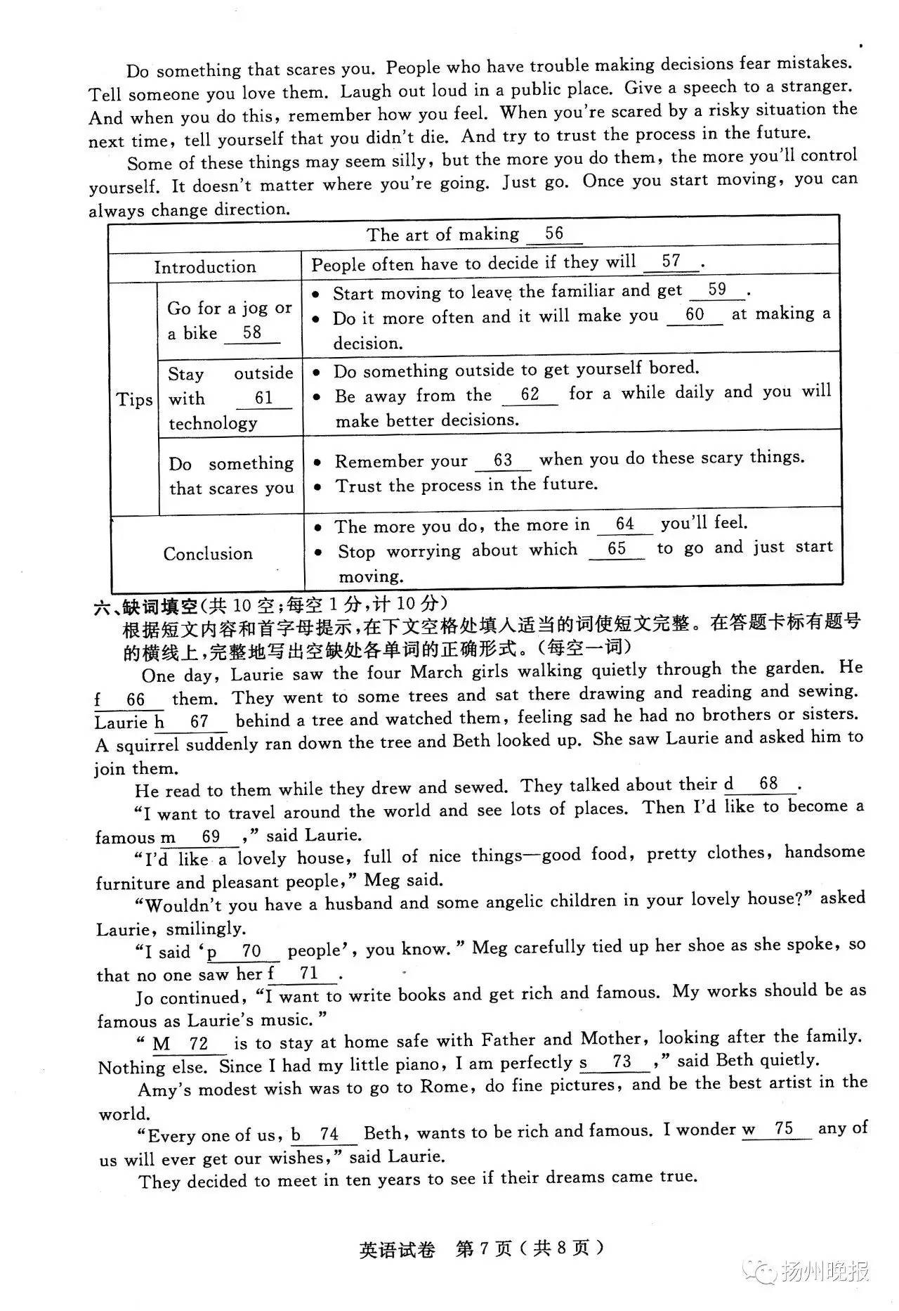 作文坚持“开放性”,寓基本写作能力考查于平常之中。书面表达是“我市正在举办中学生导游大赛,请根据以下的流程图完成一篇参赛的导游词。”字数100个左右,开头与结尾已给出。作文命题有时代元素,更有扬州元素。内容贴近生活、贴近时代、关注热点、体现扬州地方特色。考生只要平时认认真真进行写作训练,具备基本的写作能力,运用平时所学就能写出不错的文章。