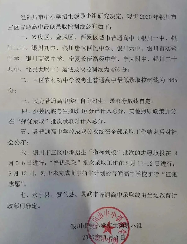 兴庆区、金凤区、西夏区城市普通高中最低录取控制线为475分;三区农村学校考生普通高中最低录取控制线为445分;民办普通高中实行自主招生,录取分数线自定。