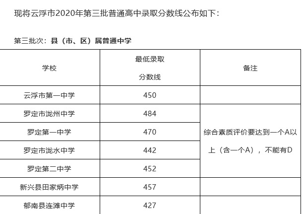 现将云浮市2020年第三批普通高中录取分数线公布如下: