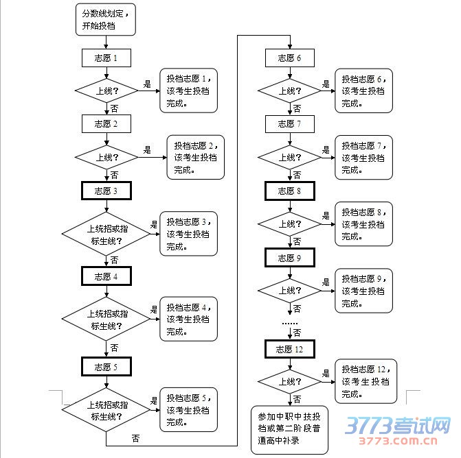 (六)普通高中投档。对于每一名考生,在特长生、统招生和指标生等各类最低录取控制分数线划定后,电脑从考生所填志愿的志愿1开始,逐个判断志愿是否上线,到志愿12止,最终选择排最前面的上线志愿投档作为考生的录取学校。一名考生普通高中志愿投档的流程图: