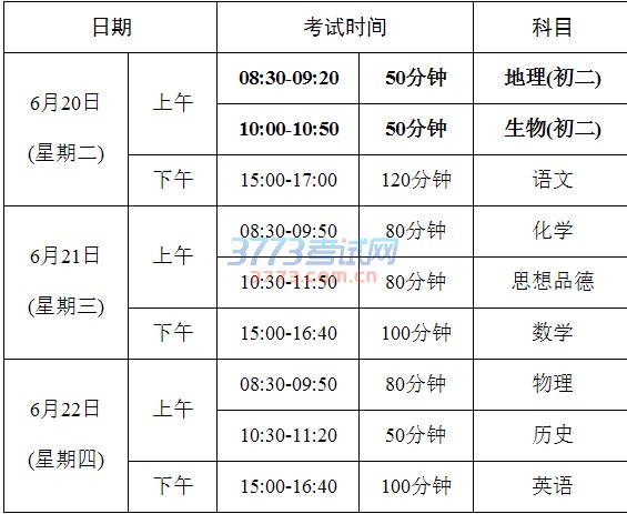 初中学业考试时间为6月20日至22日,具体安排如下: