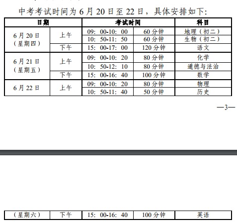 中考考试时间为 6 月 20 日至 22 日,具体安排如下: