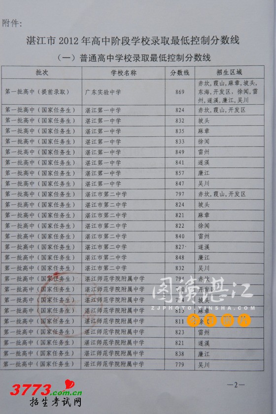 湛江市2012年高中最低录取分数线湛一中市区分数824