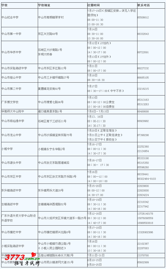 2012年中山市普通高中学校入学注册时间安排表及入学注册须知