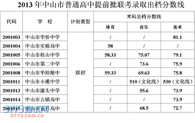 2013中山中考提前批次录取分数线与出档分数线