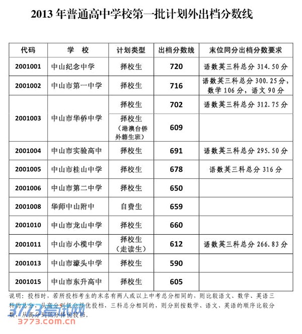 关于公布中山市2013年普通高中第一批学校第三层次(择校生)出档分数线的通知