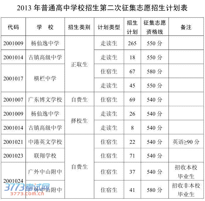 2013年中山市普通高中招生录取第二次征集志愿通知
