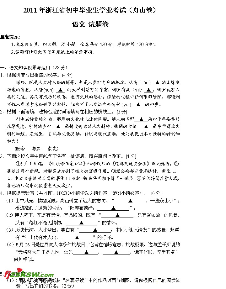 浙江舟山2011年中考语文试题及答案