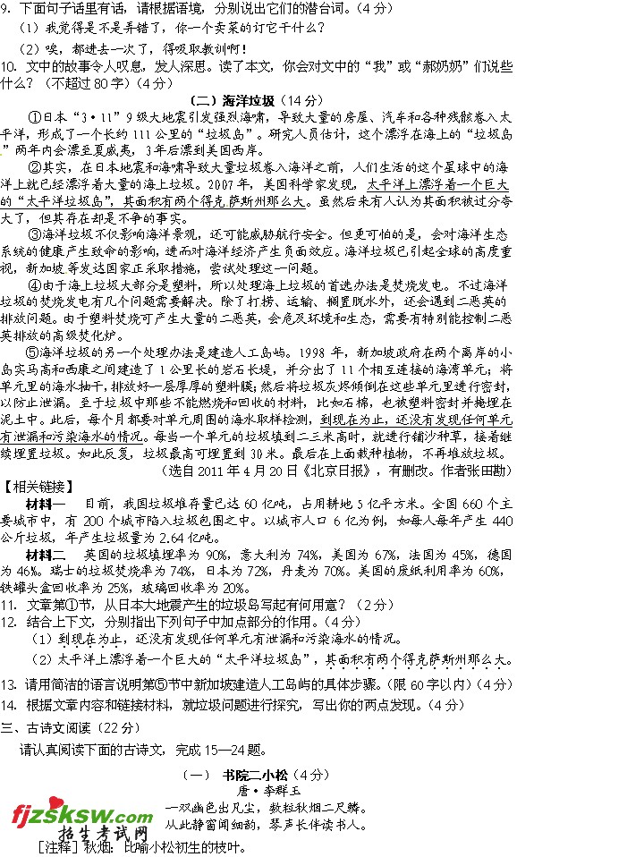 2011年浙江嘉兴、舟山中考数学试题及答案