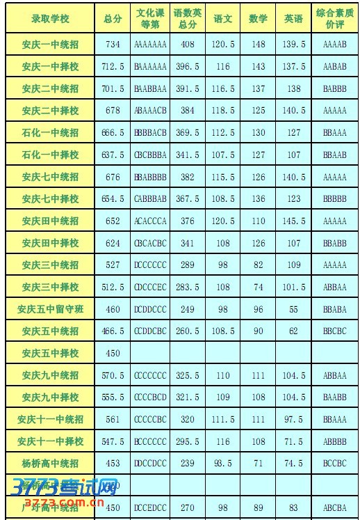 2012年安庆中考录取分数线(示范高中和公办高中)