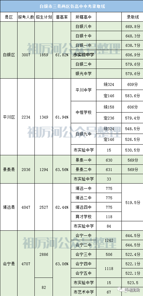 白银区内的八中、十中录取线依然位居一二;其次是会宁一二中位居第三;普高率景泰县最高达到63.56%;平川区实行农村定向招生,对农村学生倾斜,希望在会宁也能实行农村定向政策。