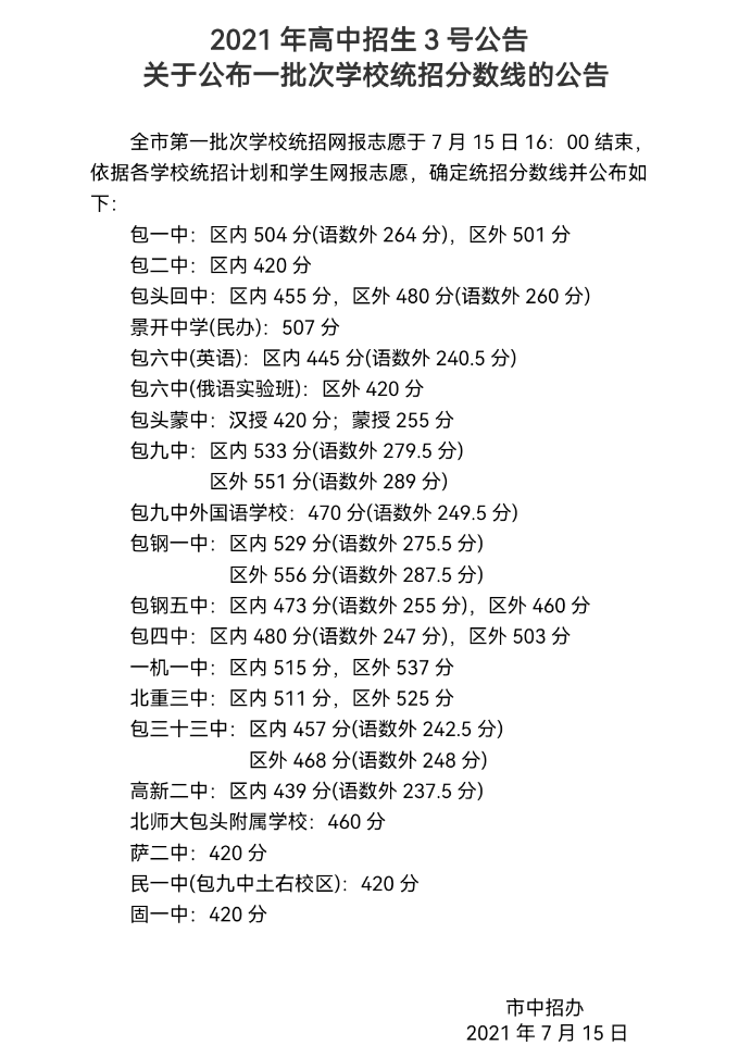 2021年内蒙古包头中考第一批次学校统招录取分数线公布,希望对同学们有所帮助,仅供参考。