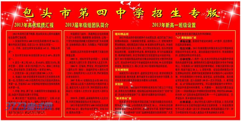 2012年包头四中依托教师子女优质生源,成功打造了2012级理科精品班。为确保教学质量,培养拔尖人才,使教育教学更加精细化,理科精品班只招收30名理科优质毕业生,并由包头四中培养出多名考入清华、北大学生的自治区、包头市级理科名师任教。该班教学特点是:教学进度快,学习内容覆盖面宽,教师辅导到位,并且学校理化生实验室完全对该班开放。鉴于2012级理科精品班的成功做法和该班学生对教学的高度认可,包头四中特决定今年继续面向全市招收30名优秀理科毕业生,倾全校之力,精心打造2013级理科精品实验班。