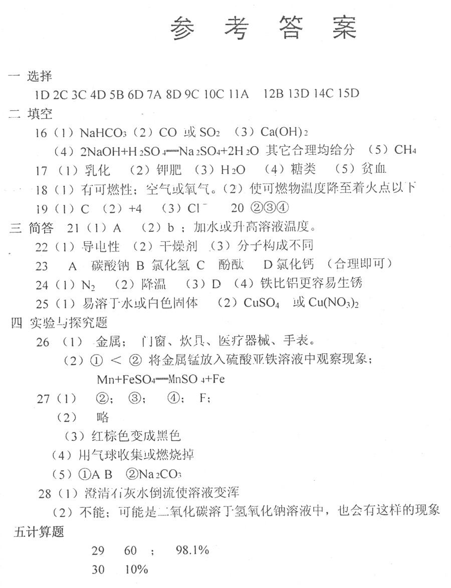 九年级第二次质量测试化学答案