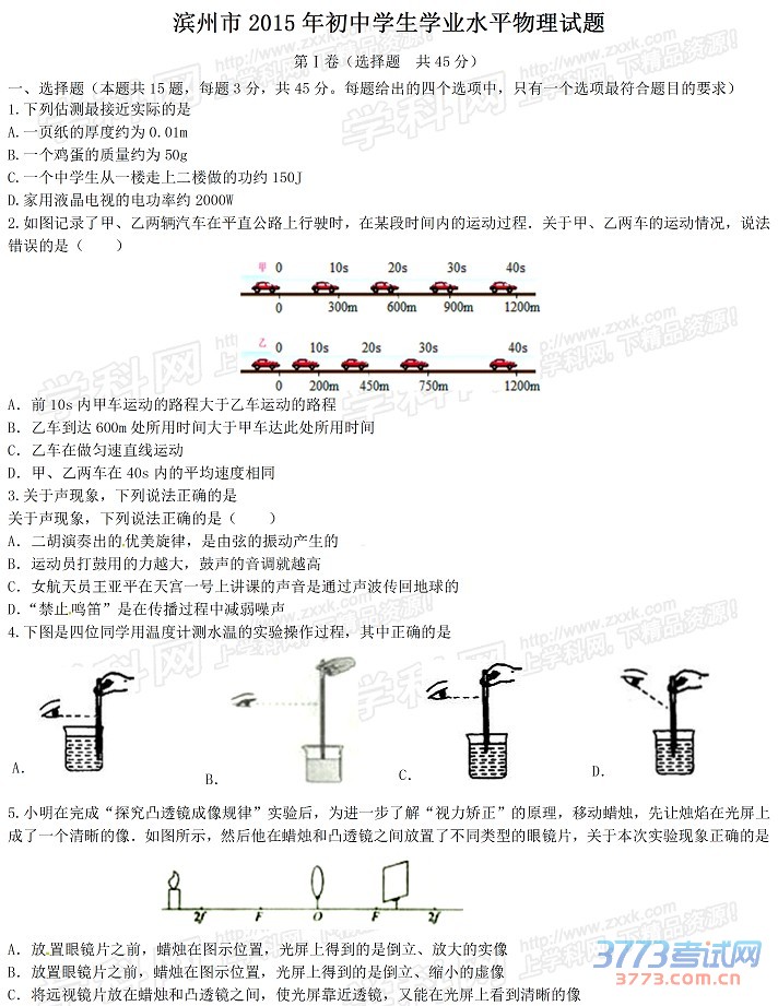 及时公布济南中考试题、答案和中考作文。祝各位考生都能取得好的成绩。2015年山东省滨州市中考物理试题及答案: