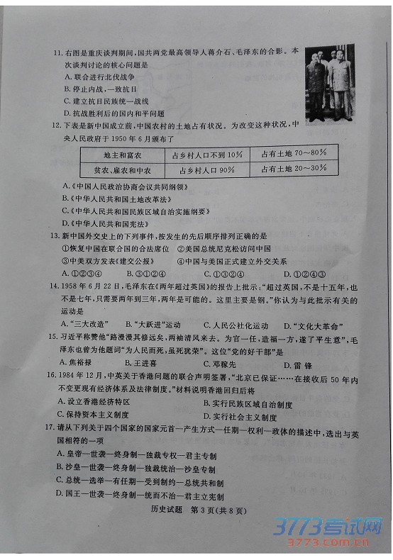 山东省滨州市2015年中考历史试题(扫描版,无答案)