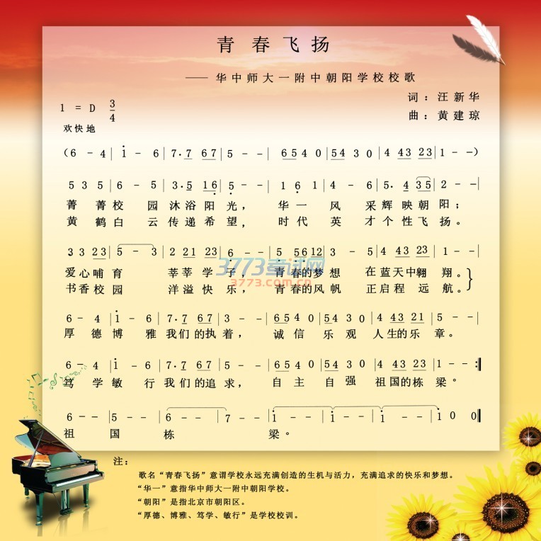 左上角为华中师大一附中朝阳学校校徽;正中题写的“华中师大一附中”由前国家主席李先念题字,是学校简称。底色为白色,寓意洁白如新,好描绘最新最美的蓝图;字体为红色,寓意青春如火,可焕发最鲜最活的生机。