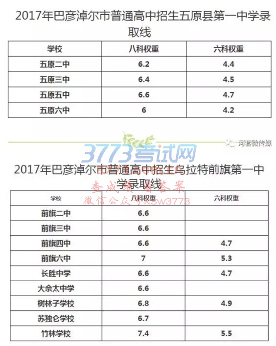 2017年巴彦淖尔市普通高中招生五原县第一中学录取线学校 八科权重 六科权重五原二中 6.2 4.4五原三中 6.4 4.5五原五中 6.6 4.7五原六中 6 4.2