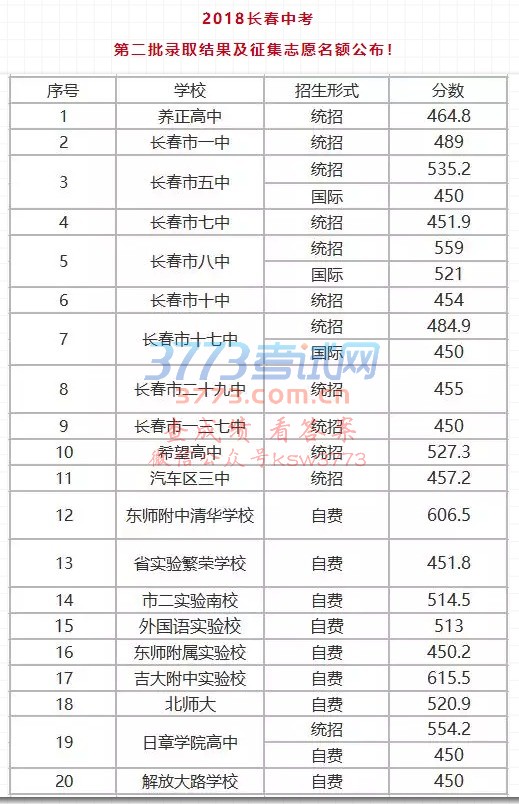 2018长春中考第二批次录取分数线公布