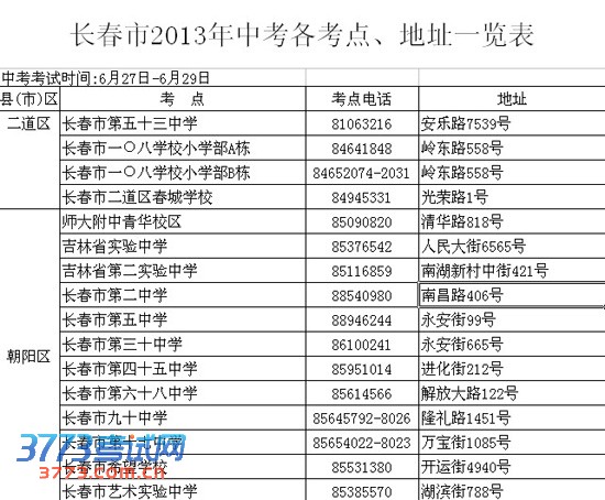 吉和网6月24日报道 记者从长春市招生委员会获悉,2013年长春市中考全市设中考考区15个,考点68个,考场2008个。具体考点地点见附表。2013年中考考试时间为6月27日-6月29日,具体考试时间和科目如下: